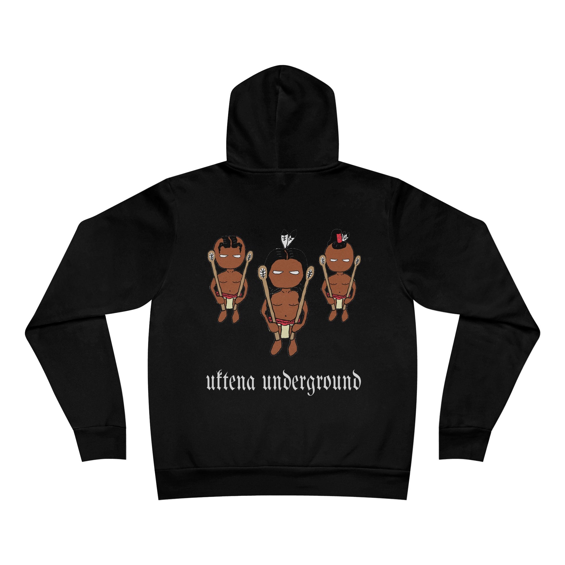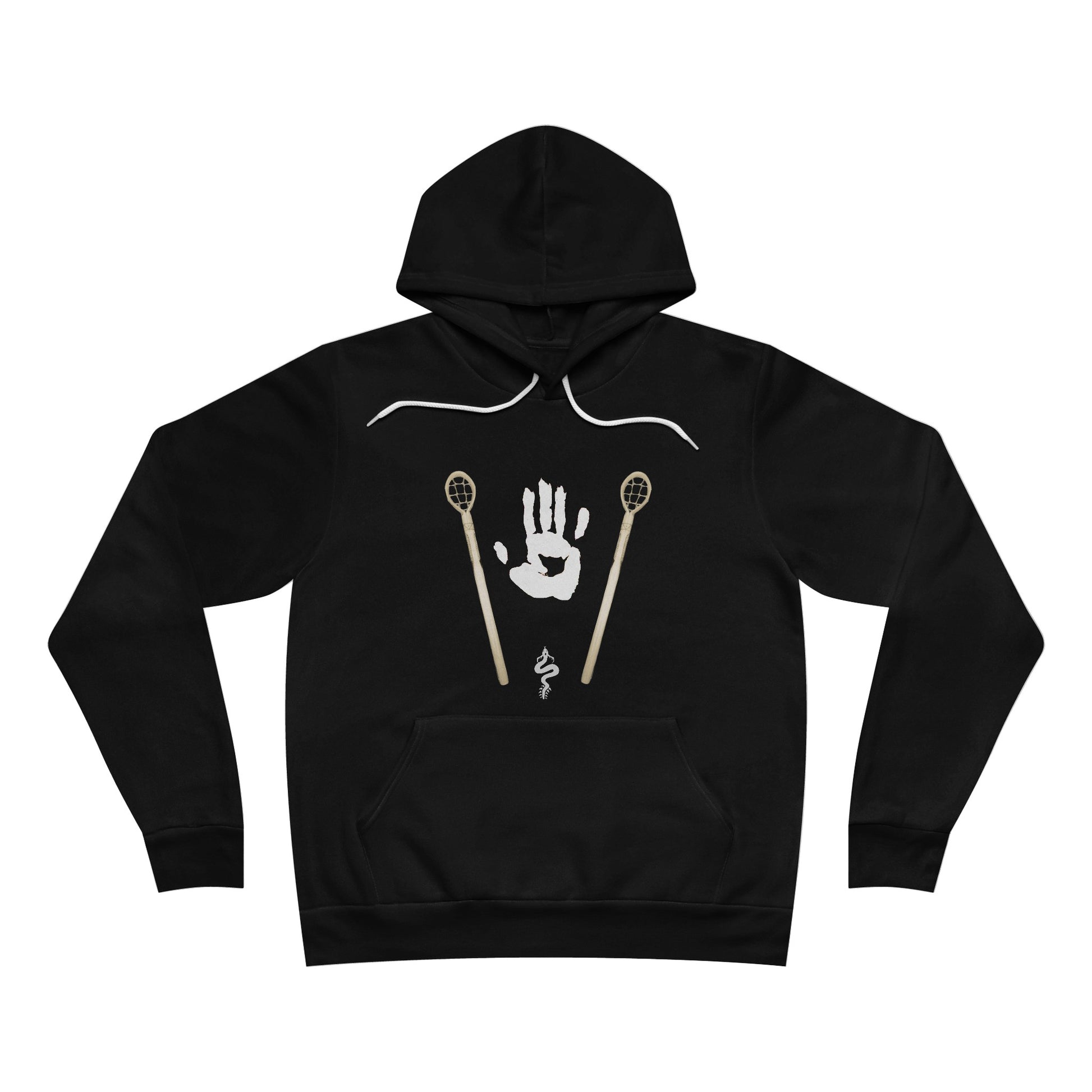 The unisex sponge fleece pullover hoodie is a blend of Airlume cotton and polyester. The percentages vary according to color. A pouch-style pocket spreads across the lower half of the garment’s front. The hood can be tightened with a white drawcord. Both cuffs and waistband have ribbing for extra grip.