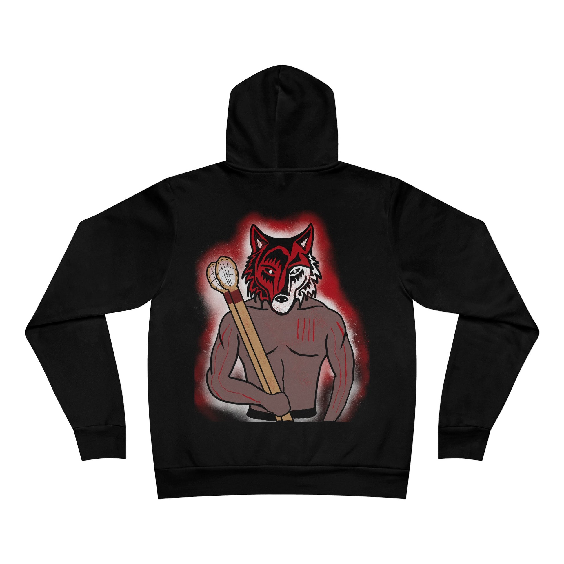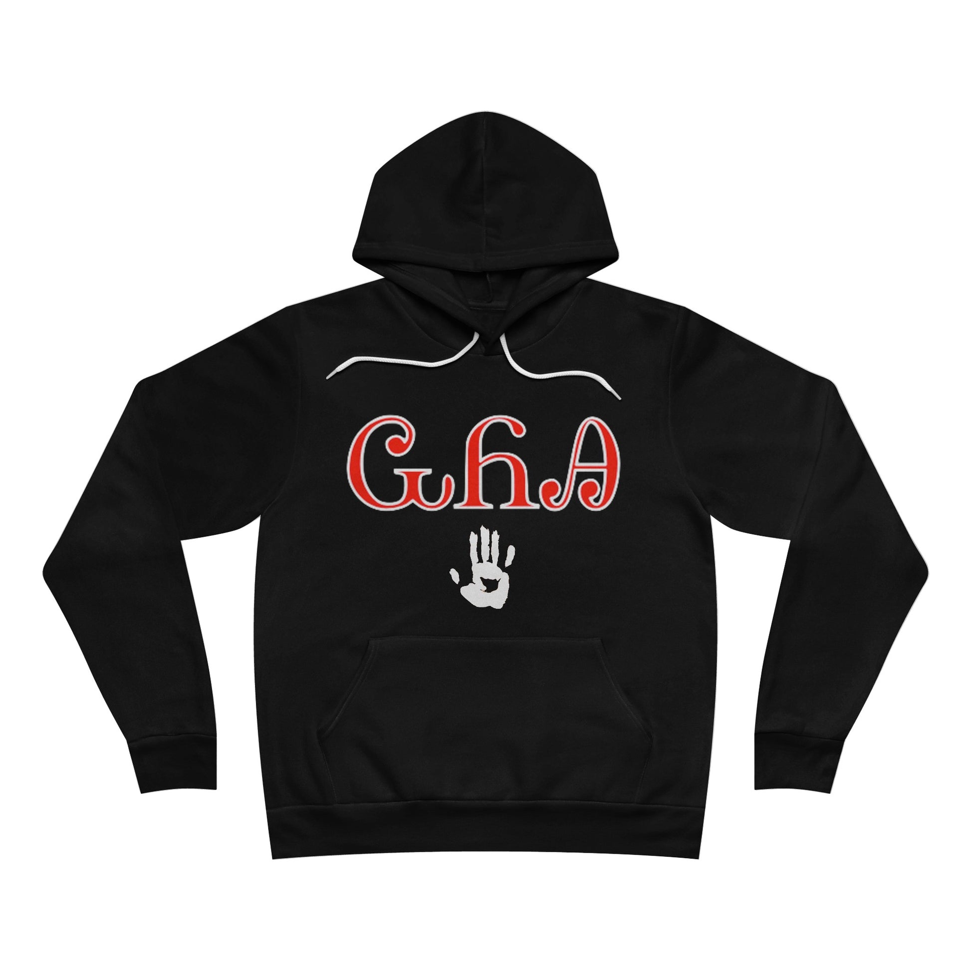 The unisex sponge fleece pullover hoodie is a blend of Airlume cotton and polyester. The percentages vary according to color. A pouch-style pocket spreads across the lower half of the garment’s front. The hood can be tightened with a white drawcord. Both cuffs and waistband have ribbing for extra grip.